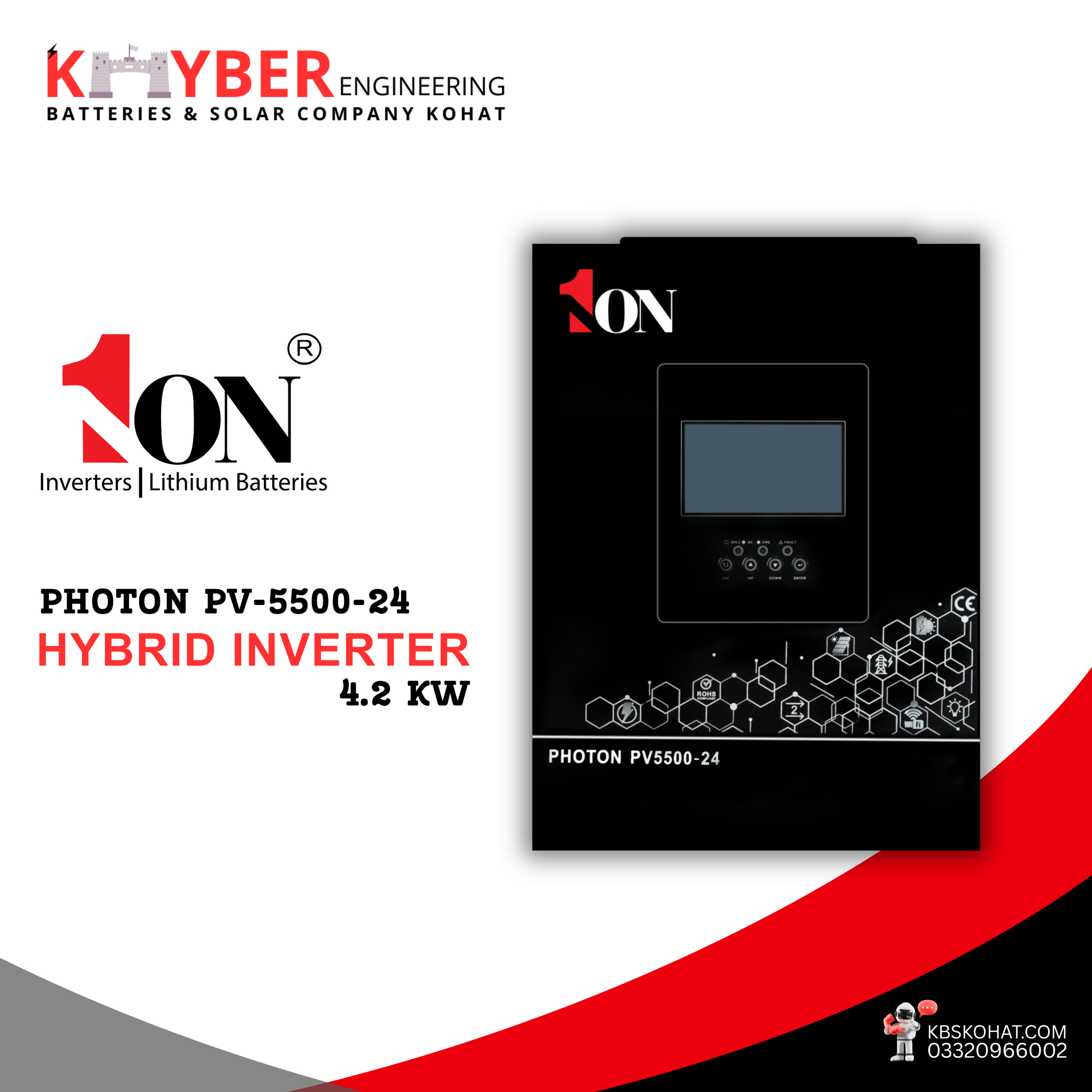 The 1ON Photon Pro PV-5500-24 delivers 4.2KW hybrid power with advanced solar and battery support. Built for efficiency and durability, it ensures stable performance, smart energy management, and reliable backup for homes, shops, and offices.