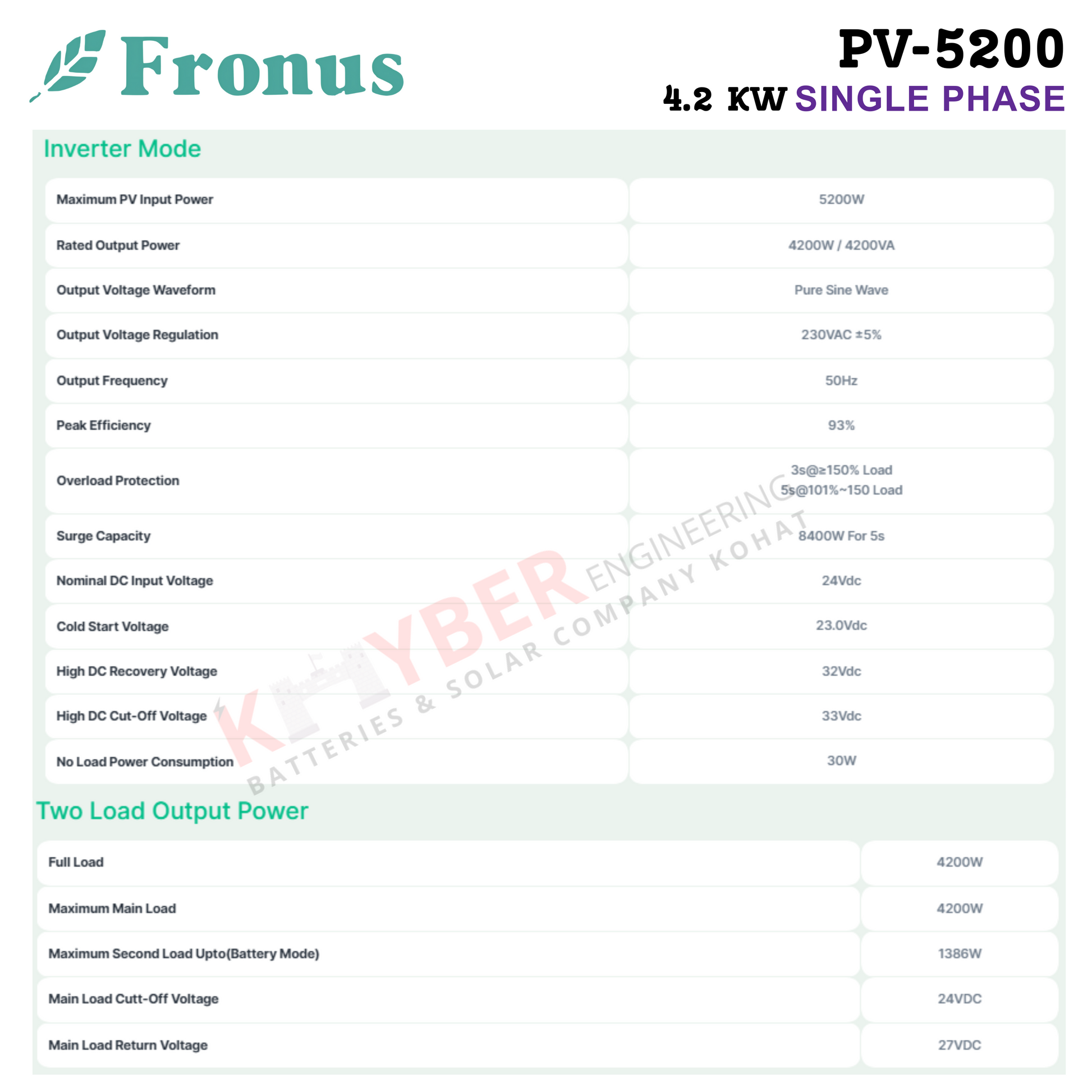 The Fronus PV-5200 (4.2KW) hybrid inverter is built for homes and small businesses requiring higher capacity. Featuring wide PV input, dual output, and Wi-Fi monitoring, it ensures smart and uninterrupted solar energy.
